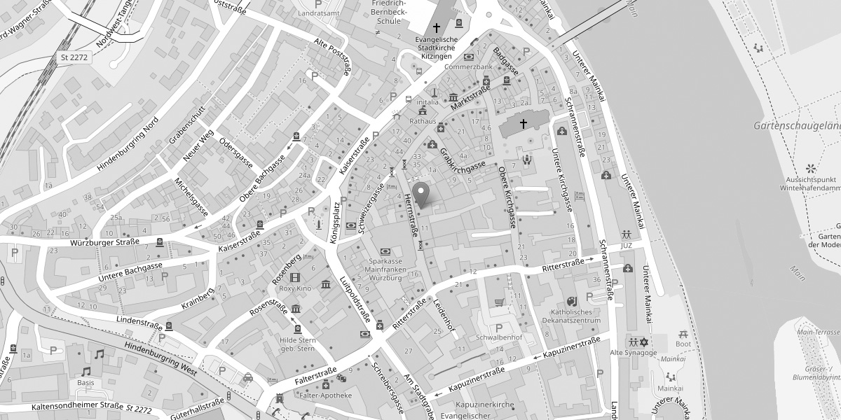 Die Herrnstraße liegt in der historischen Altstadt, am Ende der Fußgängerzone, in unmittelbarer Nähe zum Marktplatz und der alten Mainbrücke.