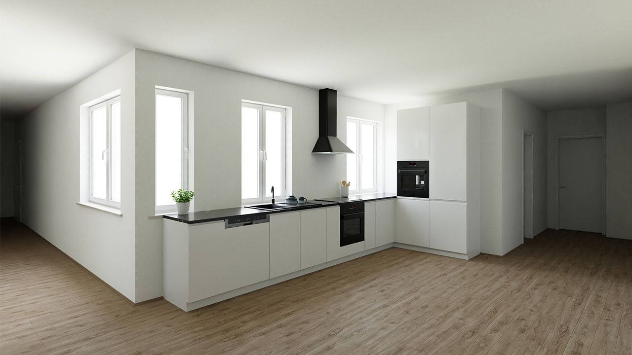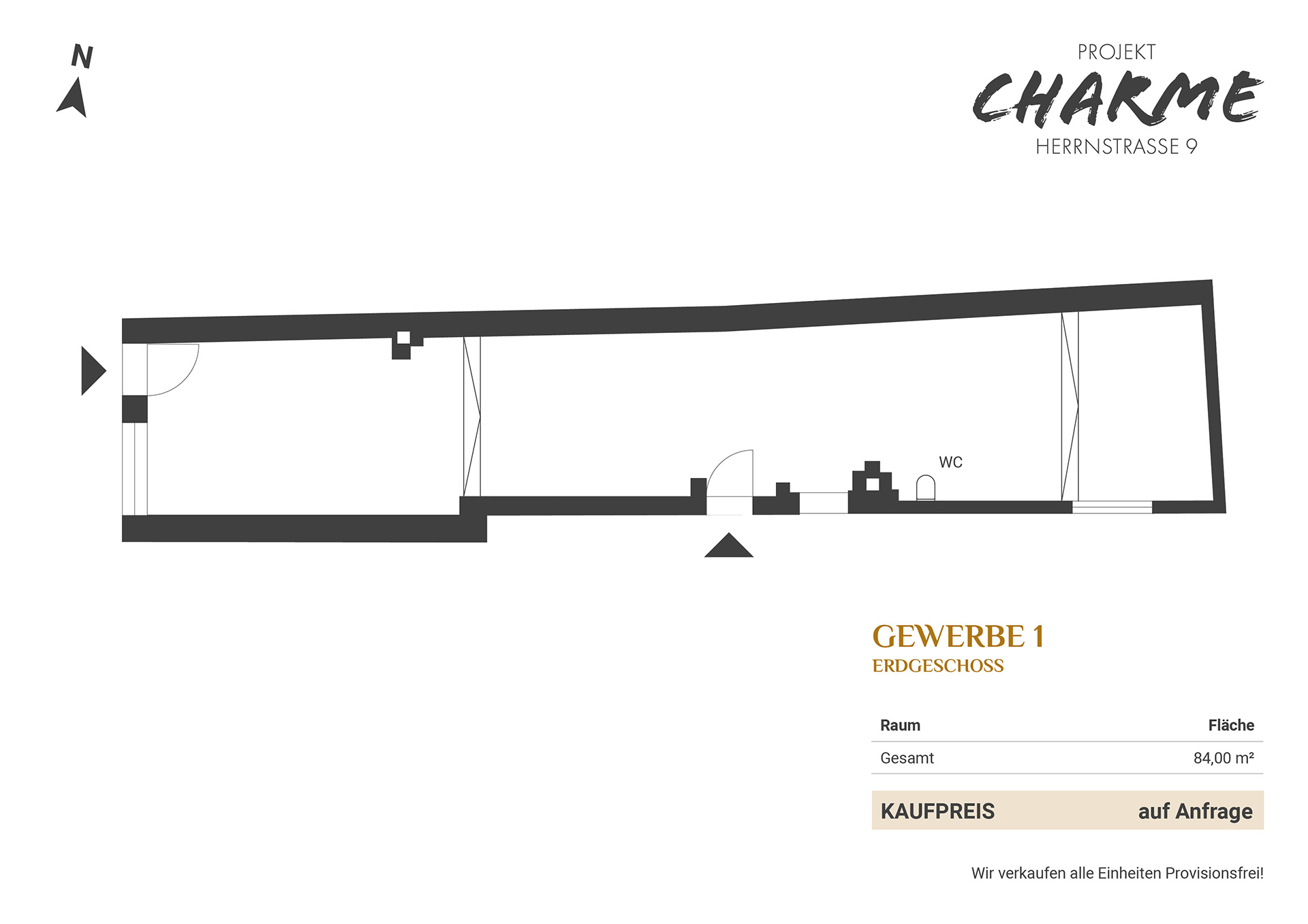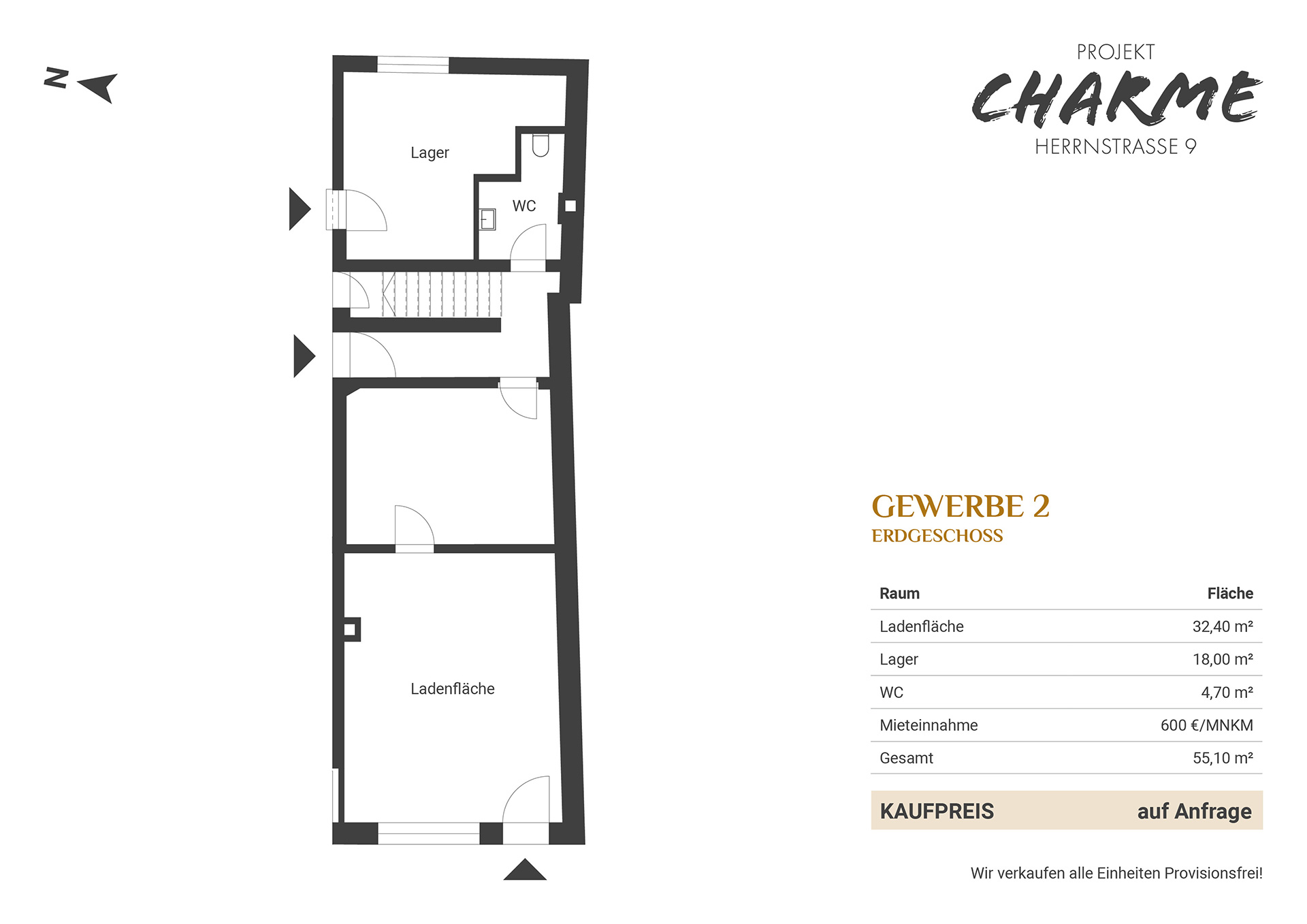 Im Erdgeschoss entstanden zwei Gewerbe- bzw. Ladenflächen, die mit 32 m² und 84 m² zur Verfügung stehen. Der außergewöhnliche Lichthof dient als Zugang zu den Wohnungen und Stellplätzen und schafft eine romantische, zusätzliche Lichtquelle für die darüberliegenden, acht modernen Wohnungen.